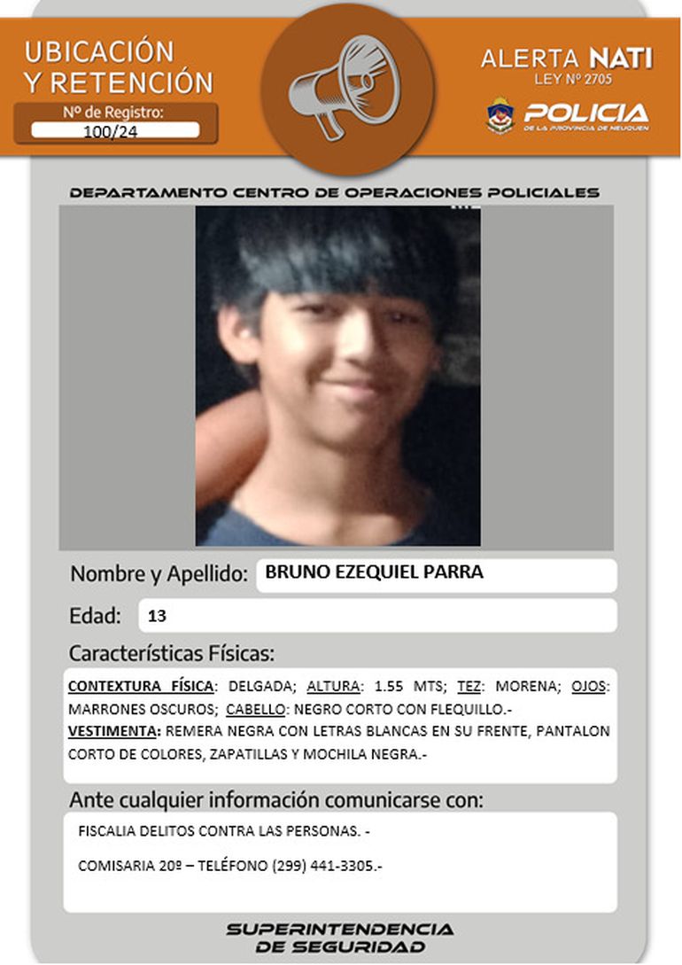 Se trata de Bruno Ezequiel Parra, de 13 años de edad. Según informaron, mide 1,55 metros, es de contextura física delgada, tez morena, ojos de color marrón oscuro y cabello negro, corto con flequillo. Al momento de ausentarse vestía una remera negra con letras blancas, pantalón corto de diferentes colores y una mochila negra.