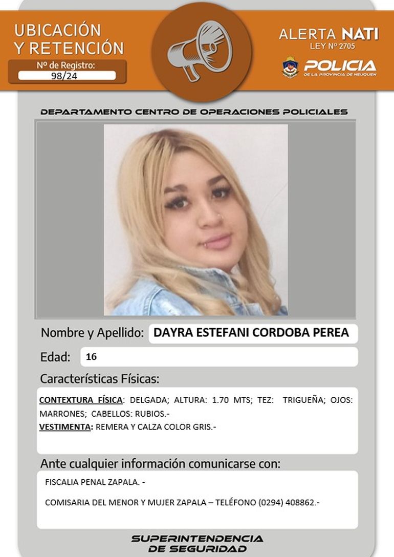 También intenta darse con el paradero de Dayra Estefani Córdoba Perea, de 16 años, oriunda de la ciudad de Zapala. De acuerdo a los datos aportados por la Policía, la adolescente mide 1,70 metros, es de contextura física delgada, de tez trigueña, ojos marrones y cabello rubio. Al momento de ausentarse vestía remera y calza de color gris.