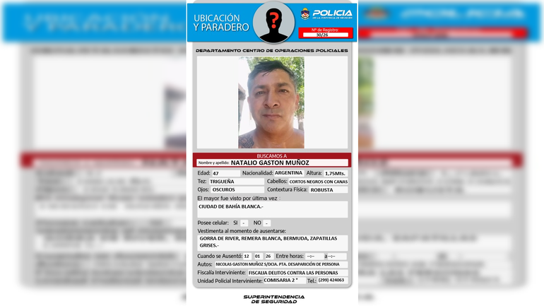 La desesperada búsqueda de un hombre oriundo de Bahía Blanca activó las alarmas de las fuerzas de seguridad de distintas provincias, incluida Neuquén. Se trata de Natalio Gastón Muñoz, de 47 años, cuyo paradero se desconoce desde el 12 de enero.