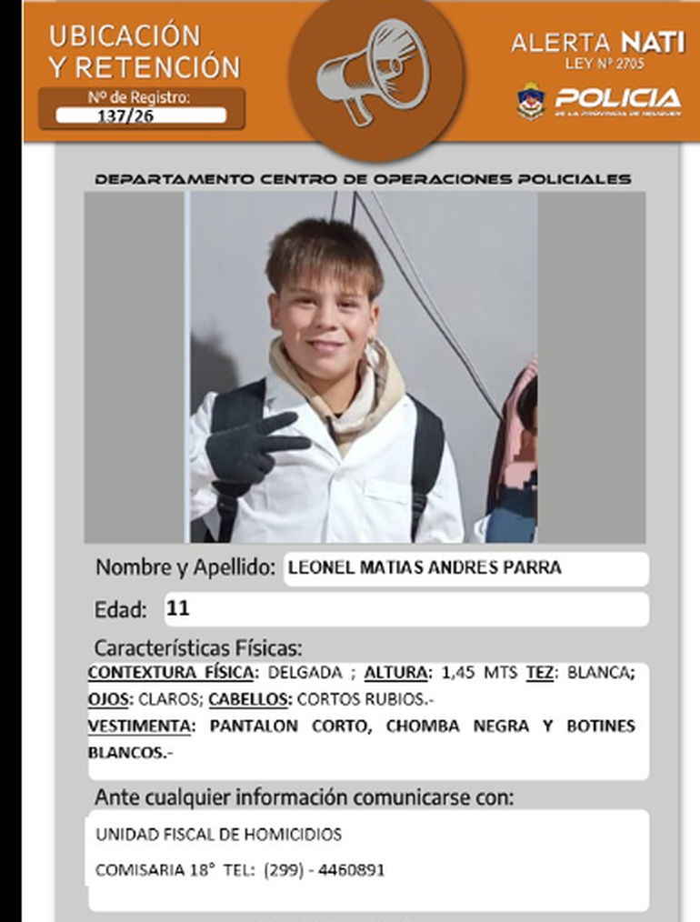 La Policía de la Provincia de Neuquén informó en horas de la tarde de este martes que el niño, cuyo nombre es Leonel Matías Andrés Parra, de tan solo 11 años está desaparecido y se emitió una Alerta Nati para dar con su paradero.