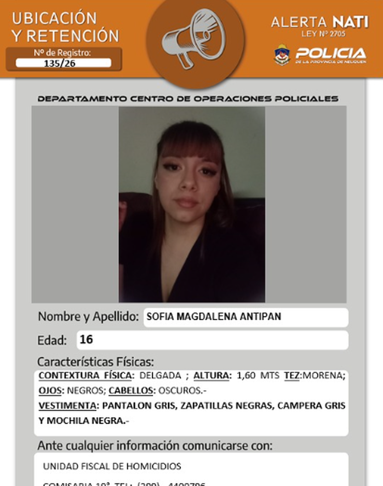 La Alerta Nati también se emitió para dar con la ubicación de la adolescente de 16 años, cuya identidad es Sofía Magdalena Antipan. Según la denuncia policial, la joven también tiene una contextura física delgada, es de 1.60 metros de altura, es de tez morena, ojos negros y cabellos oscuros.