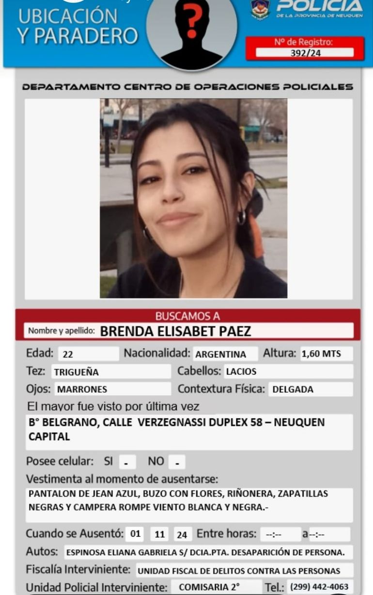 Se trata de Brenda Elisabet Páez, de 22 años de edad, quien fue vista por última vez el viernes 1 de noviembre en una vivienda de la calle Vergonssi del barrio Belgrano de la ciudad de Neuquén.