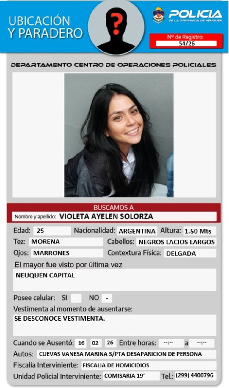 La Policía de Neuquén difundió el pedido de búsqueda de una joven que fue vista por última vez el pasado lunes 16 de febrero. Se trata de Violeta Ayelén Solorza, de 25 años.