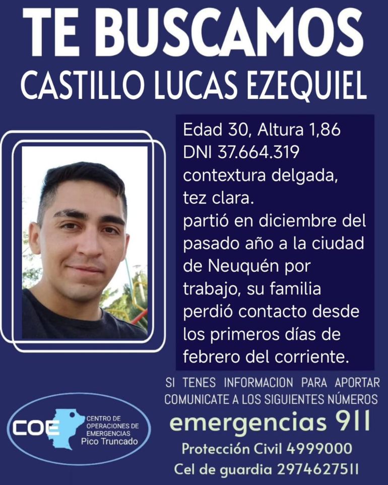 Se trata de Lucas Ezequiel Castillo, papá de tres niñas de 8, 6 y 3 años. Recientemente divorciado. Se fue de Pico Truncado el 9 de diciembre pasado y la última comunicación telefónica que tuvo fue hace 8 días atrás cuando habló con su hijita más grande. En esa llamada, indicó su abuela, comentó que se había quedado sin trabajo y les iba a mandar un dinero.
