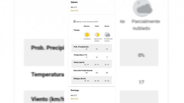 Por lo demás, el tiempo bueno será protagonista este domingo, y en esa dirección también aumentará un poco la temperatura. Tanto es así que se espera una máxima de 26 grados centígrados. La mínima pronosticada por el Servicio Meteorológico Nacional será de 9 °C.