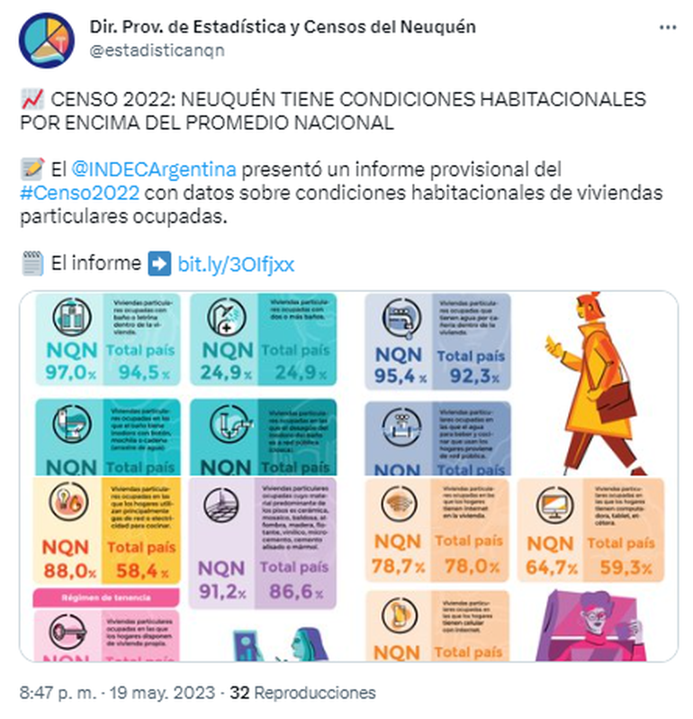 Respecto al acceso a internet y dispositivos móviles, 90,9% de las viviendas neuquinas tienen celular con internet y, a nivel nacional 89,7%. 64,7% de casas tienen computadora, frente a 59,3% en el total nacional.