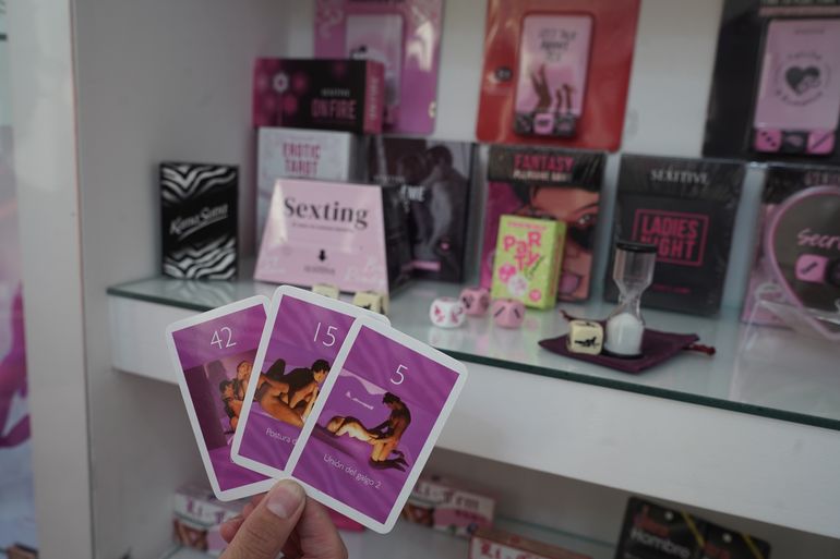 Acá las ventas se concretan de manera virtual y los productos llegan a casa por Correo Argentino. Hay un vibrador que funciona a través de una app y es para usar a distancia. Esa propuesta, que aseguró se usa mucho en parejas, cuesta 45 mil pesos. Y el kit de juego de dados y gel lubricante 5500 pesos.