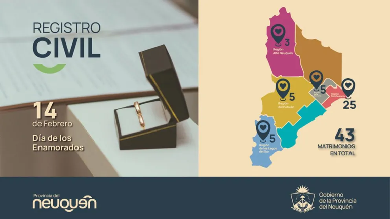 La tradicional celebración del Día de los Enamorados traerá 43 nuevas uniones formales a Neuquén. El viernes 14 de febrero, las oficinas del Registro Civil recibirán a tres parejas en la región Alto Neuquén, cinco en la Región del Pehuén, cinco en Lagos del Sur, cinco en la Comarca y 25 en Confluencia dispuestas a dar el “sí, quiero” junto a sus familias y amigos.