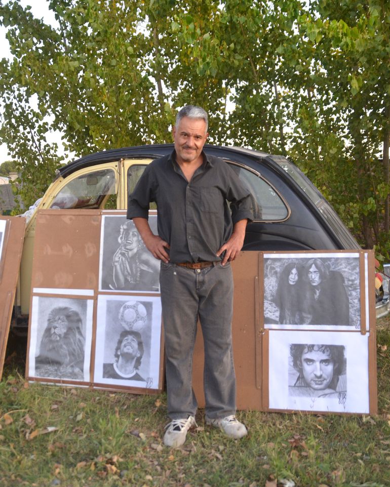 Justamente, a unos metros, en medio de la banquina, Germán Braschi le da forma al dibujo de su ídolo, el gran Ricardo Enrique Bochini (“soy hincha del lastimado Independiente”). En el césped, un cofre de madera donde guarda las herramientas y el cartelito “dibujante retratista” no pasan inadvertidos.