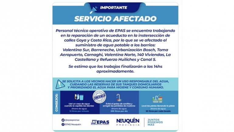 A metros del aeropuerto Presidente Perón, en la intersección de las calles Costa Rica y Goya, personal técnico del organismo provincial se encuentra trabajando para reparar la rotura del acueducto. El EPAS indicó que se encuentran afectados los barrios Valentina Sur, Barreneche, Urbanización Bosch, Toma Aeropuerto, Carnaghi, Valentina Norte, 140 Viviendas, La Castellana, Canal V y Refuerzo Huiliches.