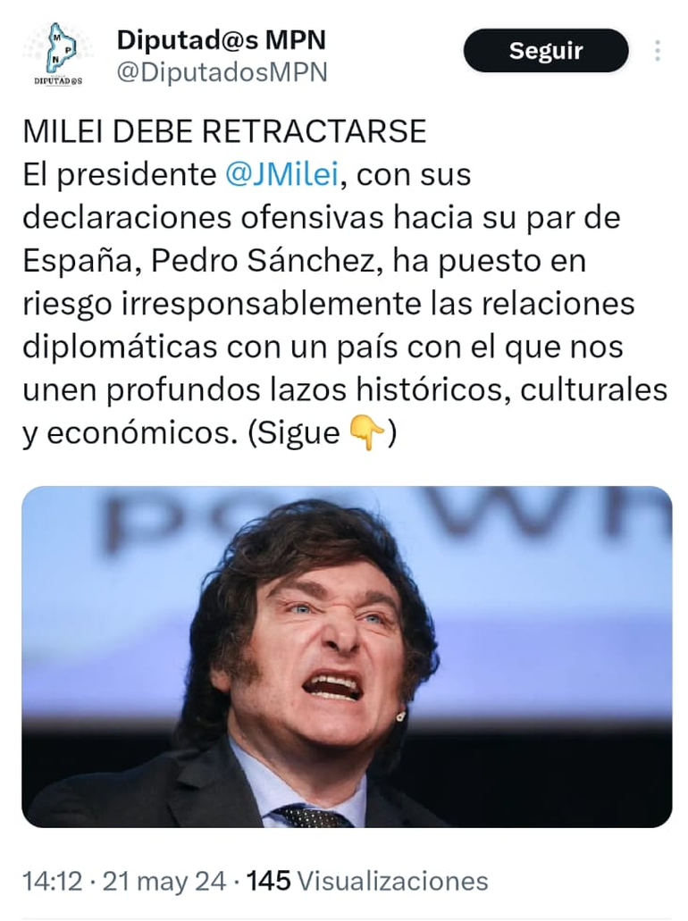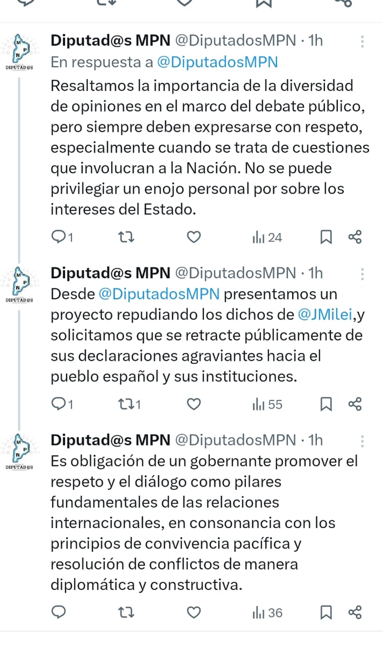 En el hilo de publicaciones en X, los diputados del MPN anticiparon que presentaron "un proyecto repudiando los dichos de Javier Milei, y solicitamos que se retracte públicamente de sus declaraciones agraviantes hacia el pueblo español y sus instituciones".