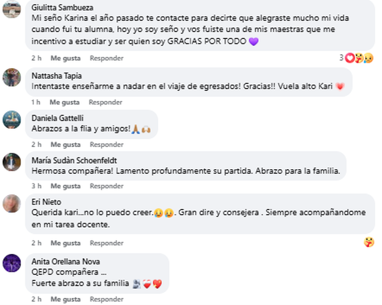 Paola Carolina Díaz destacó lo "excelente persona, docente, directora y supervisora que era, muy comprometida". En tanto, otra alumna -identificada como María Cecilia- la recordó cuando Karina ejercía la docencia en Caviahue. "Nos despidió con una carta tan hermosa en nuestro fin por el nivel medio ¡Qué triste!", comentó.