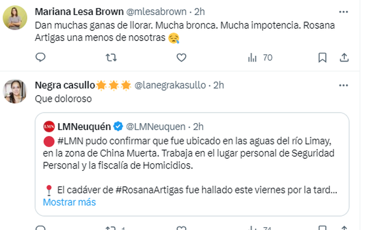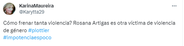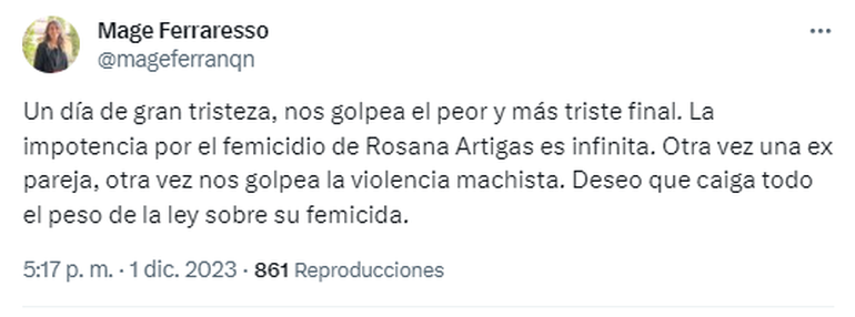 "Un día de gran tristeza, nos golpea el peor y más triste final. La impotencia por el femicidio de Rosana Artigas es infinita. Otra vez una ex pareja, otra vez nos golpea la violencia machista. Deseo que caiga todo el peso de la ley sobre su femicida", afirmó la dirigente.