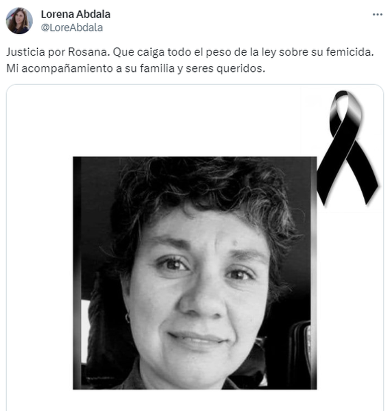 "Justicia por Rosana. Que caiga todo el peso de la ley sobre su femicida. Mi acompañamiento a su familia y seres queridos", lanzó Abdala a través de su cuenta de X.