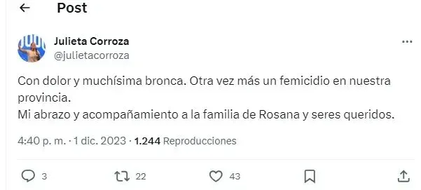 "Con dolor y muchísima bronca. Otra vez más un femicidio en nuestra provincia. Mi abrazo y acompañamiento a la familia de Rosana y seres queridos", lanzó a través de su cuenta de X (ex Twitter) Julieta Corroza, futura ministra del gobierno provincial que llevará adelante Rolando Figueroa.