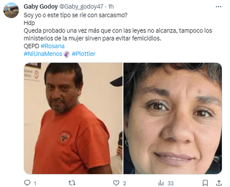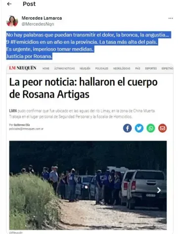 "No hay palabras que puedan transmitir el dolor, la bronca, la angustia... 9 #Femicidios en un año en la provincia. La tasa más alta del país. Es urgente, imperioso tomar medidas. Justicia por Rosana", lanzó Lamarca.