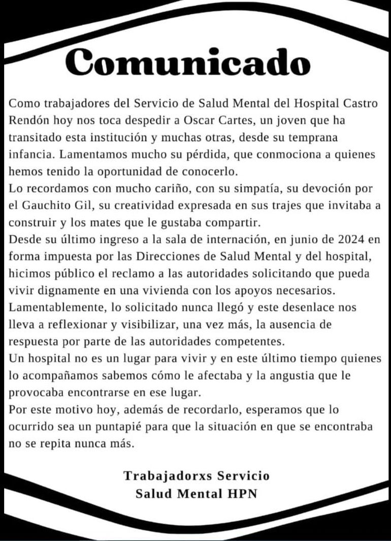 "Como trabajadores del Servicio de Salud Mental del Hospital Castro Rendón hoy nos toca despedir a Oscar Cartes, un joven que ha transitado esta institución y muchas otras desde su temprana infancia. Lamentamos mucho su pérdida que conmociona a quienes hemos tenido la oportunidad de conocerlo", expresaron con dolor.