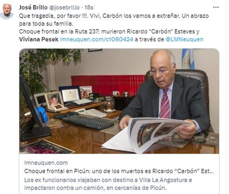 Otra figura del partido, José Brillo, y actual presidente de la Agencia de Inversiones del Neuquén (ADI) se manifestó consternado. "Qué tragedia, por favor. Vivi, Carbón los vamos a extrañar. Un abrazo para toda su familia", dijo.