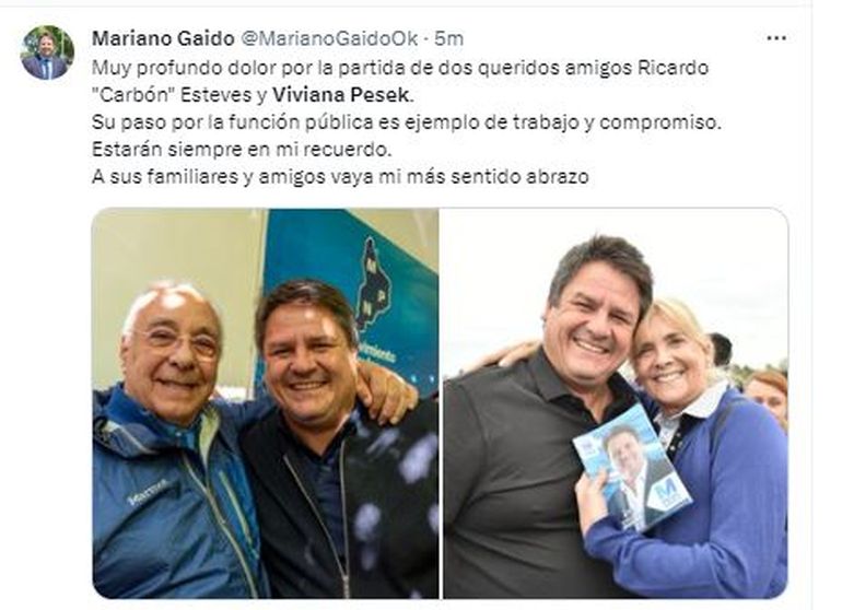 Enseguida lo hizo también el intendente de esta ciudad Mariano Gaido, quien compartió en las redes algunas sentidas imágenes de las víctimas. "Su paso por la función pública es ejemplo de trabajo y compromiso. Estarán siempre en mi recuerdo", recalcó Gaido.