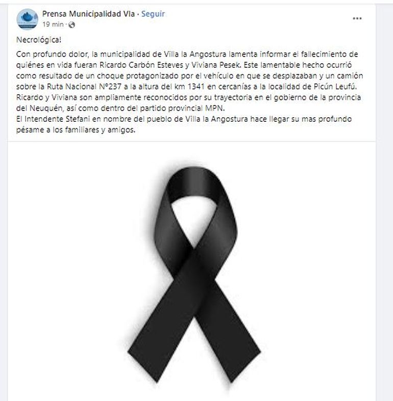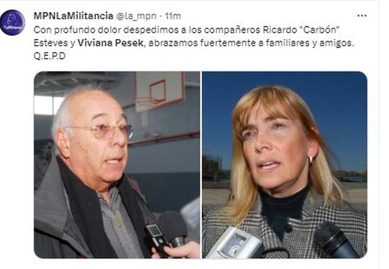 Nicolás Di Fonzo, intendente del Chocón despidió a "queridos compañeros militantes y referentes destacados de MPN, Ricardo "Carbón" Esteves y Viviana Pesek. En este momento de tristeza y dolor, extendemos nuestro más sentido abrazo a sus familiares y amigos cercanos".