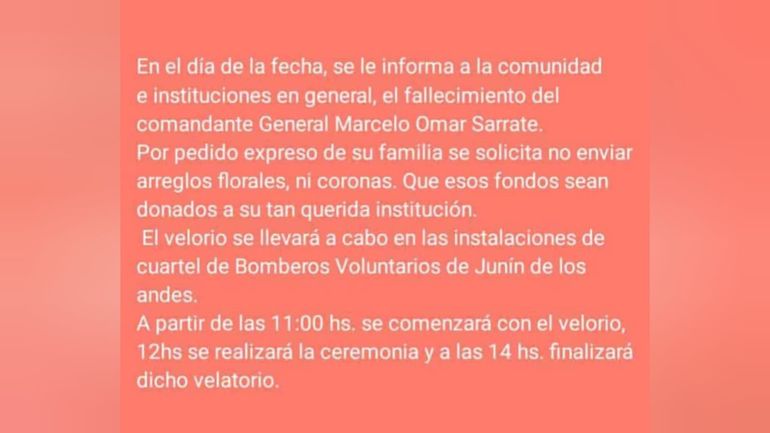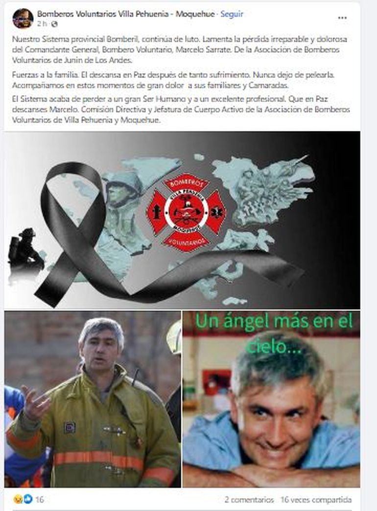 "Día muy triste para los Bomberos de la Provincia del Neuquén ante la irreparable perdida del comandante general Marcelo Sarrate, de la Asociación Bomberos Voluntarios de Junín de los Andes. Pude darte el último abrazo amigo, mucha fuerza a Cristina y sus tres hijos. Q.E.P.D.", expresó Mario Daniel Ferreyra en las redes.