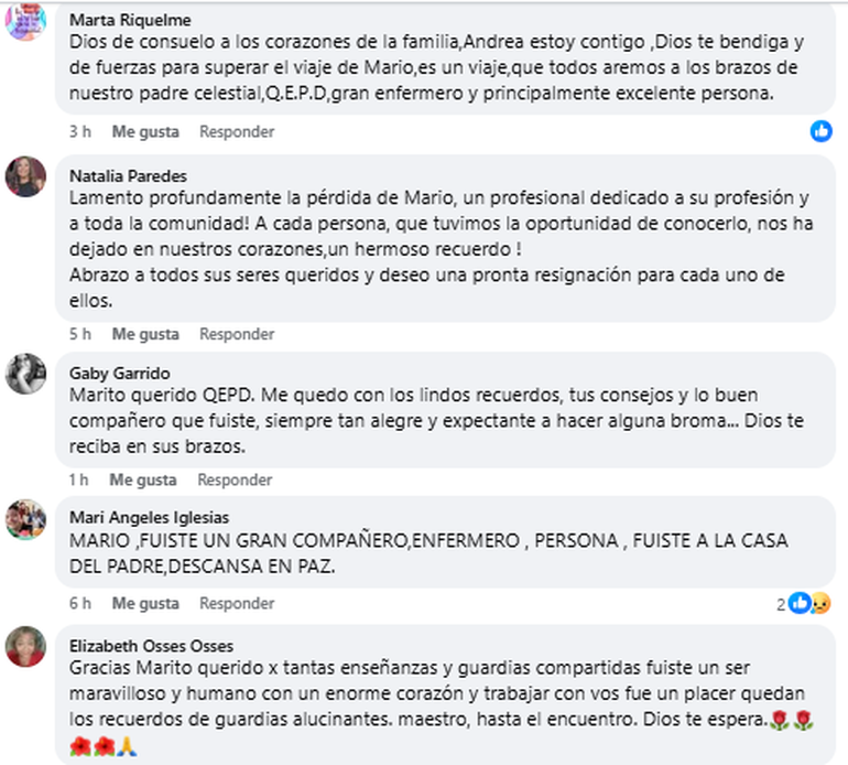 Antes de ser enfermero, había sido chofer de ambulancia y algunos compañeros lo recordaron en los tiempos en que se desempeñaba en el viejo sanatorio que fue construido por YPF. "Lamento profundamente la pérdida de Mario, un profesional dedicado a su profesión y a toda la comunidad. A cada persona que tuvimos la oportunidad de conocerlo, nos ha dejado en nuestros corazones un hermoso recuerdo. Abrazo a todos sus seres queridos y deseo una pronta resignación para cada uno de ellos", expresó Natalia Paredes.