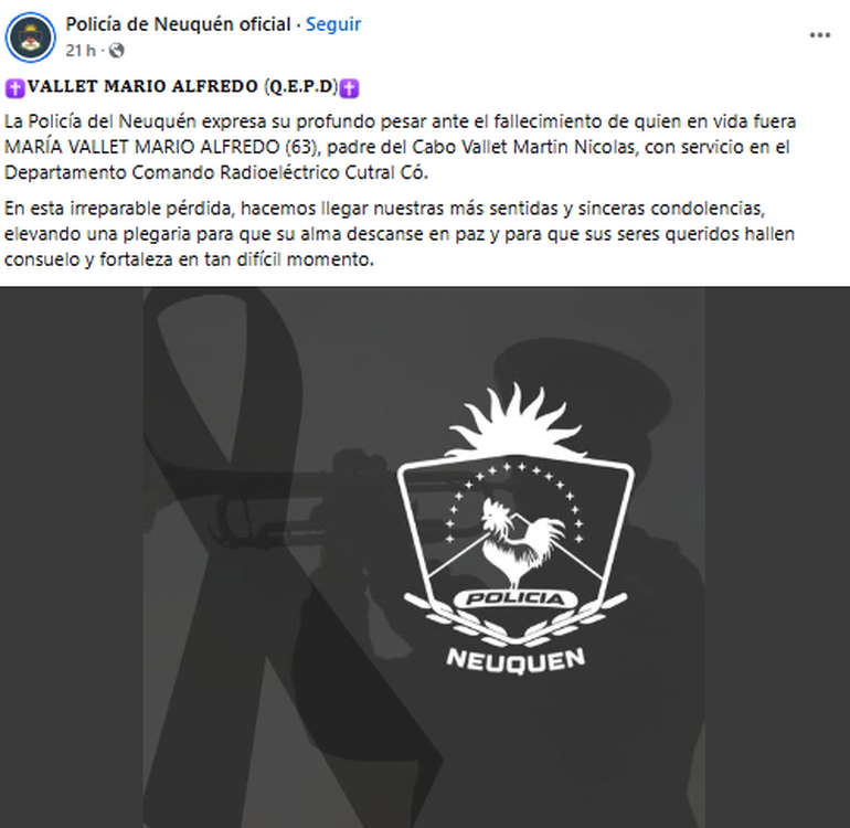 Las condolencias fueron más allá del ámbito estrictamente hospitalario, por cuanto Vallet tenía un hijo en la fuerza policial y era muy conocido. Tanto es así que la Policía de Neuquén emitió un comunicado para acompañar "en este momento de gran tristeza y dolor al camarada cabo Nicolás Vallet Temi, con servicio en el Comando Radioléctrico de Cutral Co, y a toda su familia".