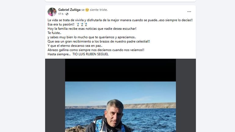 Destacó que la pesca era la pasión de este hombre que perdió la vida ayer en el río Aluminé. “Te fuiste... y sabes muy bien lo mucho que te queríamos y apreciamos… ¡¡Que sea un gran recibimiento a los brazos de nuestro padre celestial!! ¡¡Y que el eterno descanso sea en paz... Abrazo gallina como siempre nos decíamos cuando nos veíamos!! Hasta siempre... TIO LUIS RUBEN SEGUEL”, describe con dolor Gabriel Zúñiga.