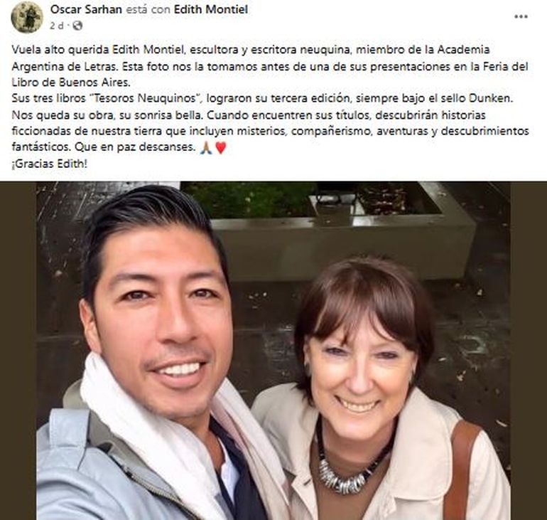 Un profesor de Arte Dramático de la Escuela Superior de Bellas Artes de Neuquén, Oscar Sarhan, la recordó con la última foto que se sacaron juntos en una edición de la Feria del Libro en Buenos Aires. "Vuela alto querida Edith Montiel, escultora y escritora neuquina, miembro de la Academia Argentina de Letras. Sus tres libros “Tesoros Neuquinos”, lograron su tercera edición, siempre bajo el sello Dunken. Nos queda su obra, su sonrisa bella. Cuando encuentren sus títulos, descubrirán historias ficcionadas de nuestra tierra que incluyen misterios, compañerismo, aventuras y descubrimientos fantásticos. Que en paz descanses", expresó en las redes.