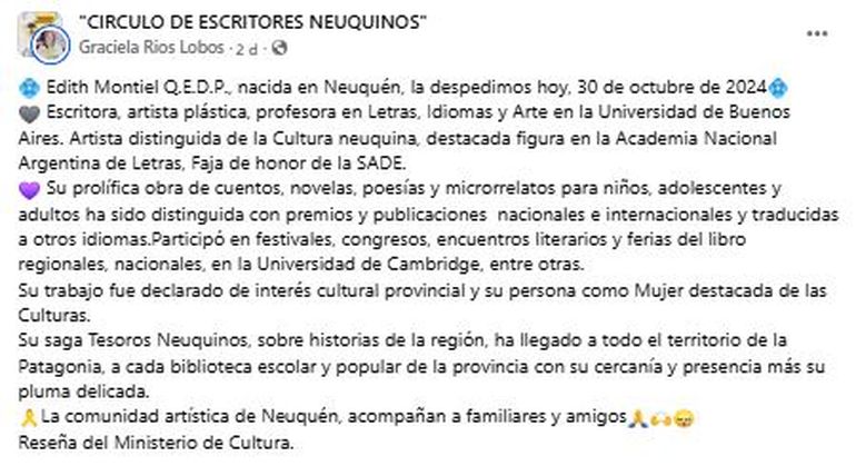 "Edith Montiel, una escritora lúcida y necesaria, nacida y criada en Neuquén. Comenzó a escribir muy joven. Dejó una vasta obra, en su gran mayoría dirigida a la literatura infantojuvenil y a la puesta en valor de la identidad de esta provincia. Fue miembro de la Academia Argentina de Letras. Recibió un sin fin de premios, en reconocimiento a su trayectoria, pero también a su elevadísima pluma. Su pérdida deja una herida profunda. Será necesario siempre seguir compartiendo su obra y hablar sobre lo mucho que quiso a la vida, a la que honró hasta el final", mencionaron.