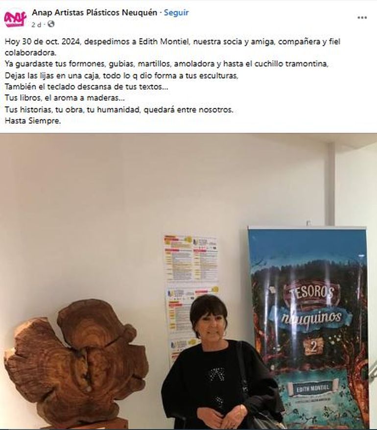 Los Artistas Plásticos Neuquén (APN) también la despidieron como "nuestra socia y amiga, compañera y fiel colaboradora. Ya guardaste tus formones, gubias, martillos, amoladora y hasta el cuchillo tramontina. Dejas las lijas en una caja, todo lo q dio forma a tus escultura. También el teclado descansa de tus textos… Tus libros, el aroma a maderas…Tus historias, tu obra, tu humanidad quedará entre nosotros. Hasta siempre".