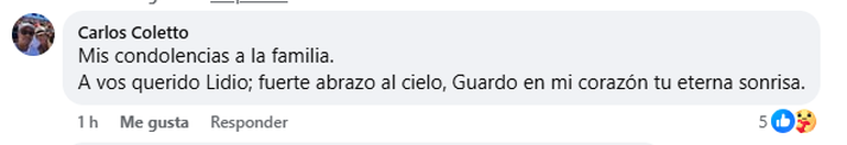 Otros, como Carlos Coletto, destacaron el recuerdo personal: “Mis condolencias a la familia. A vos querido Lidio; fuerte abrazo al cielo. Guardo en mi corazón tu eterna sonrisa”. En la misma línea, Maximiliano Perin escribió: “Gran operador, pero por sobre todo excelente ser humano y compañero. Mis condolencias y respeto a sus seres queridos”.