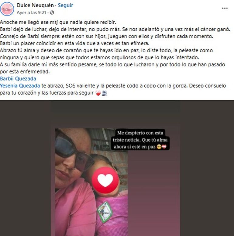 Las personas la recordaron también como alguien "muy querido por todos en Neuquén". Una pastelera que la conoció dijo que fue "una clienta que se metió en mi corazón como tantas otras. Pero ella era especial sus ganas de vivir eran inmensas. Su cuerpo no pudo más...".