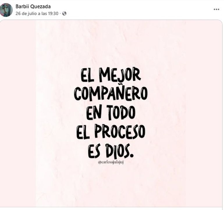 En su último posteo, el 26 de julio, Barbi compartió un publicación que dice: "El mejor compañero en todo proceso es Dios".