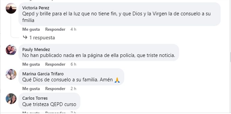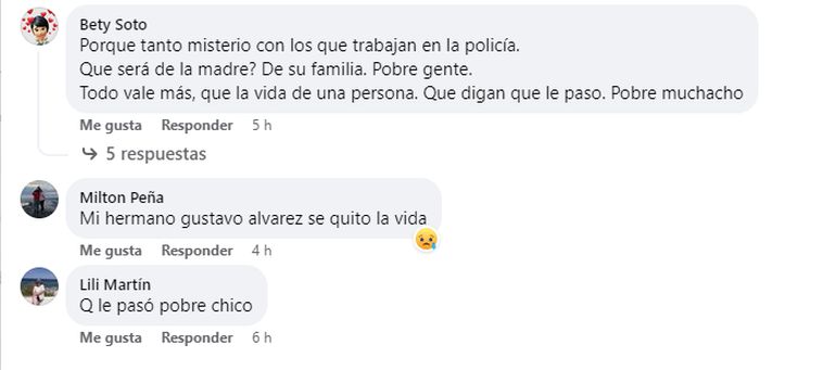 En este sentido, señalaron: “Porque tanto misterio con los que trabajan en la policía. ¿Qué será de la madre? De su familia. Pobre gente. Todo vale más, que la vida de una persona. Que digan que le paso. Pobre muchacho”, “Qué tristeza por Dios. Cuiden a nuestros Policías. Empatía sres. jefes”, “cuiden más a sus camaradas. SR. JEFE DE POLICÍA. Más empatía, por favor... nada sirve con rendirles homenajes y palabras bonitas y de alientos a los familiares”.