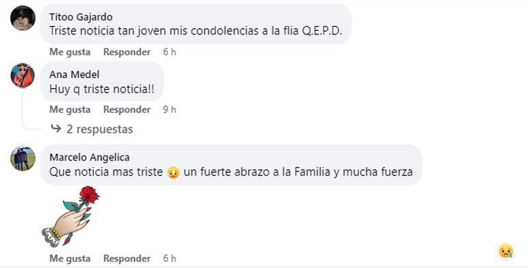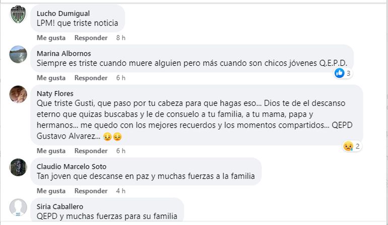 Al posteo se sumaron decenas de mensajes de dolor: “Siempre es triste cuando muere alguien, pero más cuando son chicos jóvenes Q.E.P.D.”, “Que triste Gusti, que paso por tu cabeza para que hagas eso... Dios te dé el descanso eterno que quizás buscabas y le dé consuelo a tu familia, a tu mamá, papá y hermanos... me quedo con los mejores recuerdos y los momentos compartidos... QEPD Gustavo Álvarez”, “Tan joven que descanse en paz y muchas fuerzas a la familia”, “Qepd y brille para él la luz que no tiene fin, y que Dios y la Virgen la de consuelo a su familia”.