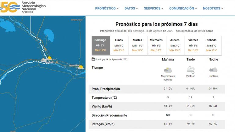 El Servicio Meteorológico Nacional (SMN) pronosticó para este domingo una baja probabilidad de lluvias, que no superarán el 10% en la región. Por la mañana estará mayormente nublado con una temperatura de 5 grados. A partir de la tarde se intensificará el viento, pero con un aumento de la temperatura que alcanzará los 17 grados, mientras que hacia la noche descenderá a 7 grados con cielo nublado. El viento será leve por la mañana con ráfagas entre 51 y 59 kilómetros por hora, pero se intensificará en la tarde con ráfagas entre 70 y 78 kilómetros por hora. Hacia la noche mermará un poco.