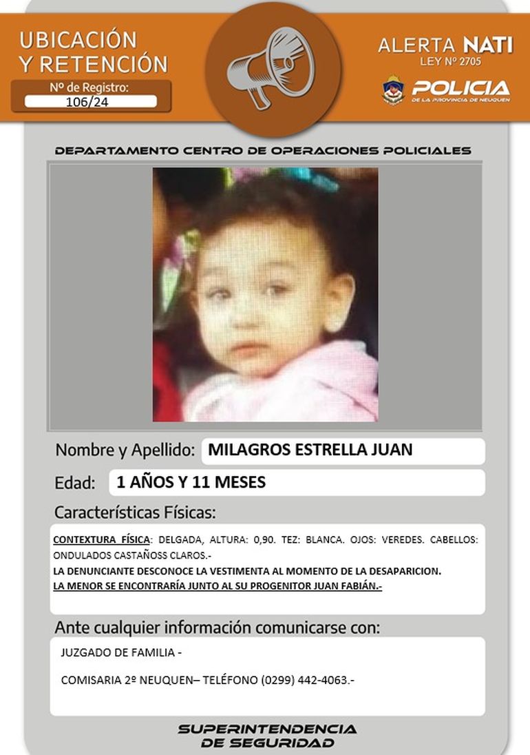 La Policía de la Provincia de Neuquén activó el protocolo por Milagros Estrella Juan, de 1 año y 11 meses.