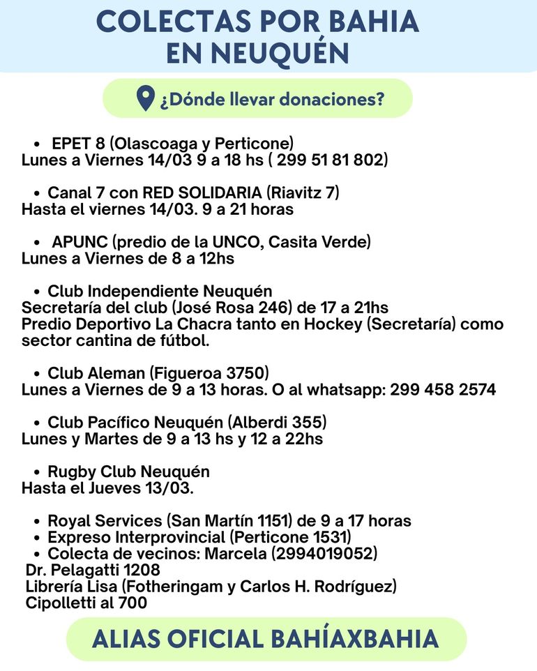 En San Patricio del Chañar reciben donaciones para los afectados por el temporal de bahía Blanca en el polideportivo municipal, sector de salón de artesanías en Pilmayquen y Quili Malal de 8 a 12 y de 19 a 21.