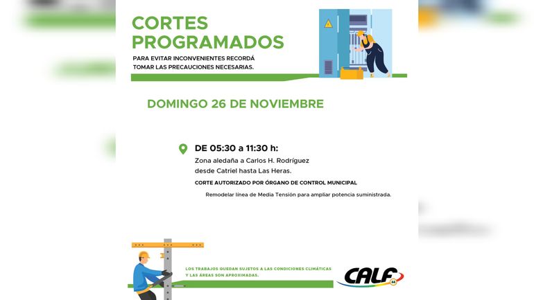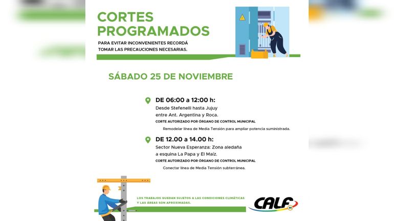 En tanto, personal de la cooperativa CALF anticipó que este sábado realizará dos cortes de luz programados. El primero, de 6 a 12 horas, afectará la calle Stefenelli, hasta Jujuy, entre Antártida Argentina y Roca. Se busca remodelar la línea de media tensión para ampliar la tensión amplificada. El otro corte será de 12 a 14, en otro sector de la ciudad: Nueva Esperanza (zona aledaña a la esquina de La Papa y El Maíz). La cuadrilla realizará trabajos para reconectar la línea de media tensión subterránea.