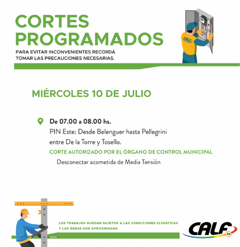 Como en cada uno de los cortes programados, la cooperativa indicó que los trabajos quedan sujetos a las condiciones climáticas y las áreas que se informan en las que se trabajará también son aproximadas.