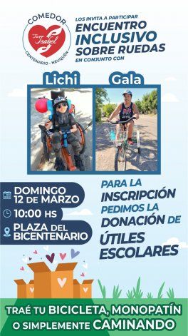 "Gala está participando del equipo de natación de la provincia y ya obtuvo muchos logros de forma deportiva y Lisandro también tiene mucha presencia en la ciudad. Entonces los invitaron para que ellos hagan difusión sobre esta campaña de recolección de útiles escolares para el merendero y también para visibilizar la discapacidad en Centenario", contó a LMNeuquén Merian Ramírez, mamá de Gala.