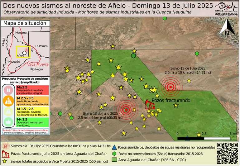 Los epicentros se localizaron a unos 45 km al norte de la localidad de Añelo y fueron calculados y registrados por INPRES. "Ambos eventos ofician nuevamente como indicadores de la asociación directa entre fractura hidráulica y sismicidad ya que la cercanía entre el epicentro y un equipo de fracturas que se encuentra operando en el área Aguada del Chañar (YPF SA y Compañia General de Combustibles) es menor a 5 km: se expone nuevamente la coincidencia espacial y temporal entre sismicidad inducida y fracking", expresaron desde el OSI mediante un comunicado.