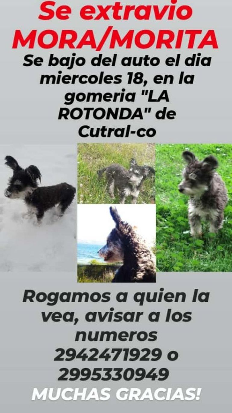 Una familia de Zapala volvía a su casa y, al hacer una parada en Cutral Co, la pequeña mascota, una Caniche Micro Toy llamada Mora, se bajó del vehículo y se perdió. Los vecinos de la Comarca Petrolera ayudan a buscar y piden que en caso de verla intenten agarrarla o den aviso.