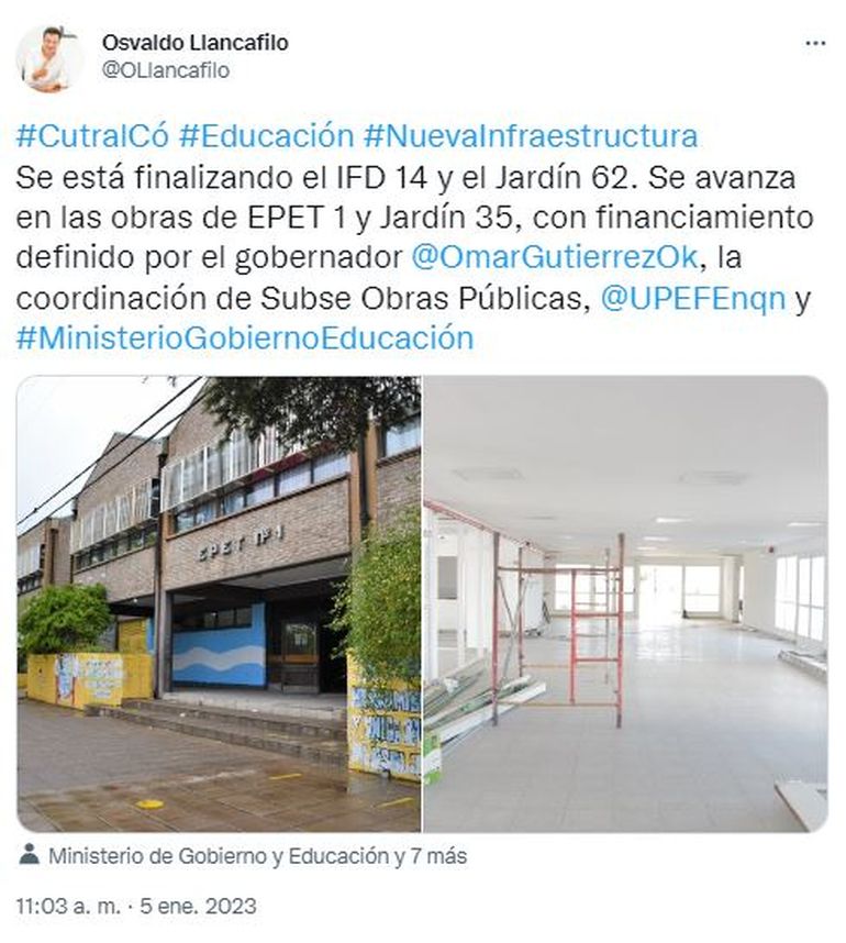 "Hay un retraso en la infraestructura escolar en la provincia", reconoció el ministro. "Necesitamos por lo menos unos dos años más o tres de trabajos como los del año pasado buscando llegar con el mantenimiento preventivo en tiempo y forma y por otro lado tener edificios nuevos como están considerados en el presupuesto provincial", sostuvo Llancafilo al abordar los desafíos que se plantean en el área Educación de cara al futuro inmediato.