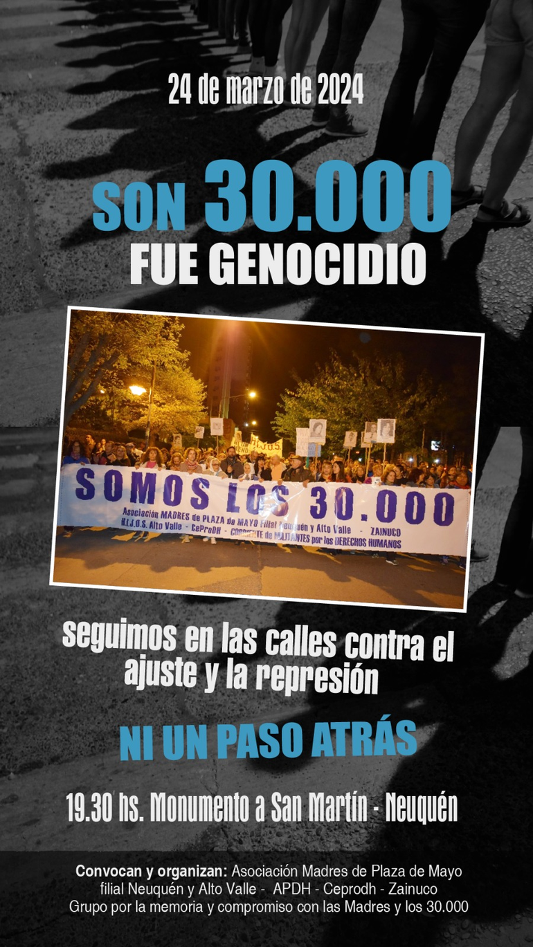 Madres de Plaza de Mayo Neuquén y Alto Valle convocaron, como todos los años a concentrarse en este 24 de marzo, a partir de las 19.30 en el monumento al general San Martín, para marchar por las calles de la ciudad por la memoria y en repudio del peor genocidio que atravesó el país durante la última dictadura militar.
