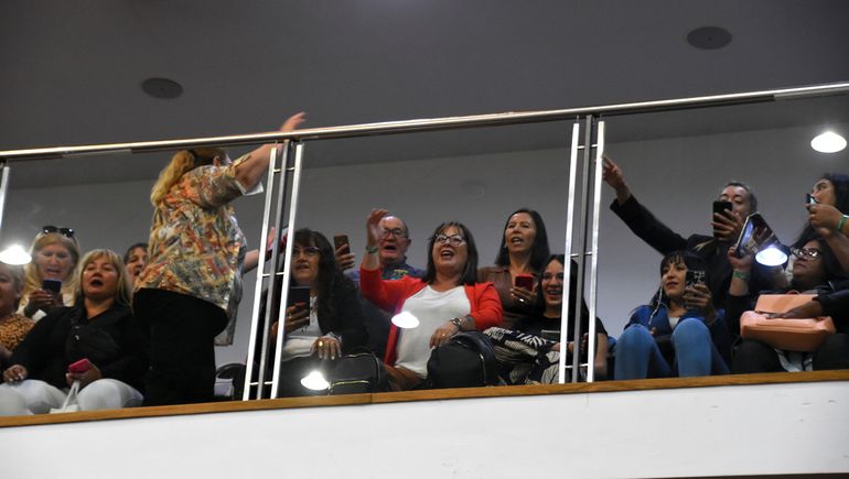 También a la salida del recinto las militantes del MPN esperaron al gobernador para continuar con sus aplausos y cánticos de apoyo.
