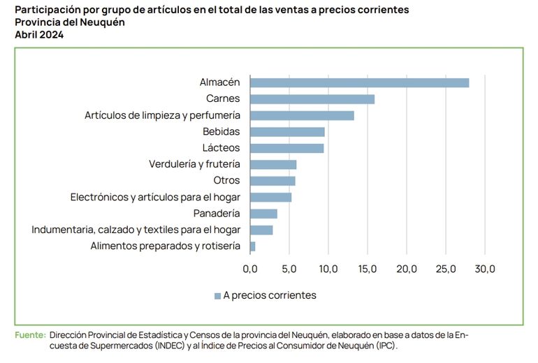 El grupo almacén explica poco menos del 30% del total de las ventas de los supermercados, con lo cual por poco no duplica el aporte del grupo carnes, el segundo en importancia por encima de Artículos de limpieza y perfumería.