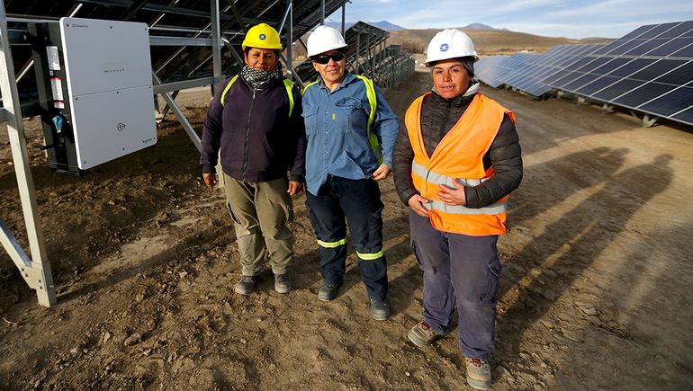 Margarita Sáez (46 años), Claudia Retamal (40) y Ayelén Aguilera (27) llegaron a este trabajo por necesidad y, también, por esas vueltas de la vida. Margarita es integrante de la familia que permitió el uso de las tierras para que se construya el parque solar. Y además la trabajadora manejará el complejo una vez que comience a producir energía.