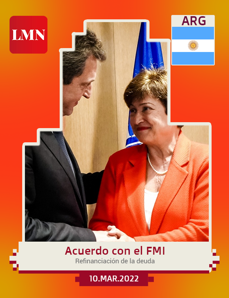 El gobierno nacional alcanzó un acuerdo con el Fondo Monetario Internacional (FMI) para refinanciar la deuda de 45 mil millones de dólares y así postergar los vencimientos previstos para 2022 y 2023. De esta manera, el Estado argentino se someterá a un proceso de 10 revisiones para obtener más de cuatro años de gracia y comenzar a pagar el dinero adeudado en 2026. Aunque el acuerdo fue resistido por distintas organizaciones sociales, finalmente fue aprobado pro el Congreso y permitió darle algo de alivio a la economía argentina.